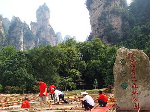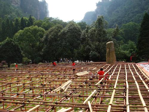 2008中國湖南國際旅游節(jié)開幕式舞臺位于世界自然遺產張家界國家森林公園老磨灣,根據(jù)導演組的舞臺美術設計,分為主體演出舞臺和方陣舞臺,總面積1600多平方米,總共將容納1600人同臺演出。其中主體舞臺長40米、深度為31.5米、高1.5米,方陣舞臺為42米長、深度9.5米、最高達10.5米的弧型階梯式舞臺。整個工程共需要使用25噸左右的鋼管,舞臺表面每平方米能夠承重600公斤以上。
