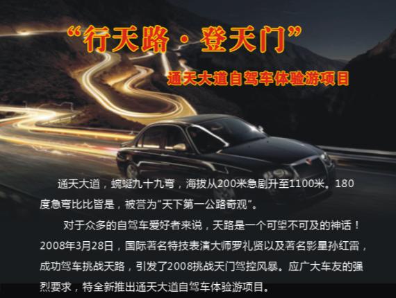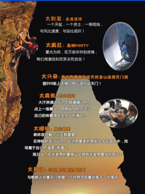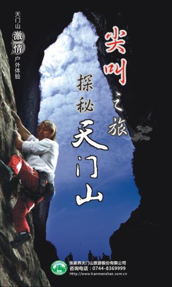 2008年9月,天門山景區(qū)全新推出“尖叫之旅,探秘天門山”戶外體驗(yàn)項(xiàng)目。項(xiàng)目?jī)?nèi)容包括懸崖速降,星光露營(yíng),極限攀巖,野外燒烤,戶外拓展等,所有體驗(yàn)項(xiàng)目均由曾擔(dān)任過(guò)法國(guó)蜘蛛人阿蘭·羅伯特陪練的國(guó)內(nèi)資深戶外教練親自操練并全程指導(dǎo)。