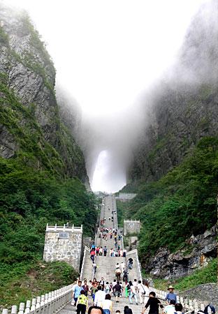 選擇乘索道游覽天門山是最佳視角。索道吊廂一出站房,馬上就騰空飛了起來,從城市的一棟棟樓頂掠過,猶如在城市上空滑翔。翻過一道山梁之后,城市被遠遠拋在了視線以外,大片翠綠的稻田映入眼簾,透過打開的通風(fēng)窗口,一陣陣青草水田特有的清香沁入心脾。或高或低的農(nóng)舍不時從我們身下滑過,牛羊們?nèi)齼蓛捎崎e的在田間浮動著,靜謐、安詳。再翻過一座山峰,我們便立即被滿山的青翠所包圍,萬仞絕壁也已投懷送抱。索道支架矗立于絕壁天險中,或挺立或傾倒或探頭或擁抱,我們繼續(xù)在艱險中游歷,時而隱沒于云堆,時而出世于蒼穹。這時你除了那滿懷的驚險刺激外有的便只有望索而興嘆了。我拍了很多片子,但是總覺得還是沒有足以記錄下來這座空中盆景的壯麗。