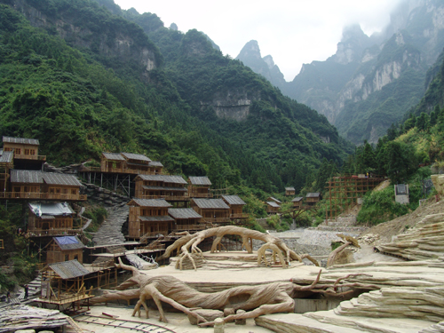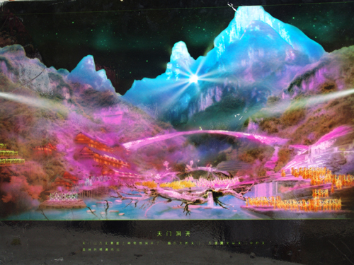 張家界天門山大型山水實景音樂劇《新·劉海砍樵》是世界上第一臺以高山奇峰為舞臺背景,以山澗峽谷為表演舞臺,有完整故事情節(jié)的音樂歌舞劇。舞臺選址在天門山風(fēng)景區(qū)山門口內(nèi)至天門山頂?shù)恼麠l峽谷,主舞臺以10000平米的玻璃鋼打造,是目前世界最大的全景玻璃鋼舞臺,背景融合了壯美瑰麗的奇峰險壑、峽谷里的飛瀑流泉、空中的霧嵐飛煙、山上的林木花草以及壯觀的天門洞,整體形成了一個縱深10余公里,橫寬高差逾千米的超級大舞臺。同時,在峽谷山澗之間還將搭建一個跨度60米,高度32米的伸縮飛橋,這是目前世界范圍的演出項目中絕無僅有的大型舞臺機械裝置。這些獨有的裝置將成為該劇實現(xiàn)特殊藝術(shù)表現(xiàn)力和巨大視覺沖擊力的獨特資源。