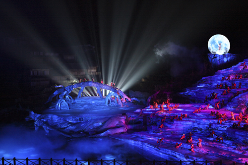 本項(xiàng)目舞臺(tái)及舞美設(shè)施為目前世界范圍內(nèi)的實(shí)景演出中投資最多、舞臺(tái)機(jī)械裝置最為復(fù)雜且規(guī)模最大、燈光設(shè)施數(shù)量最多且分布范圍最大的,另外主舞臺(tái)也是世界最大的全景玻璃鋼舞臺(tái)(10000平方米)。舞臺(tái)機(jī)械設(shè)施中,尤其是跨度60米、高度32米的伸縮飛橋,是目前世界范圍的演出項(xiàng)目中絕無(wú)僅有的大型舞臺(tái)機(jī)械裝置。燈光數(shù)量:大型燈光1100盞,中小型燈光2800盞;演出音響為專門定制的美國(guó)EAW音戶外防雨、防潮音響設(shè)備,也是目前國(guó)內(nèi)演出項(xiàng)目中投資最大的。