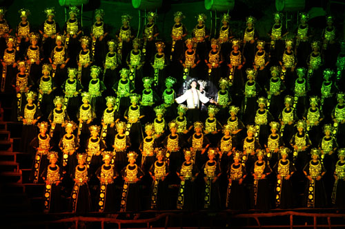 世界第一臺(tái)大型山水實(shí)景音樂(lè)劇《新劉?抽浴吩趶埣医缣扉T山試演。9月13日晚,參加2009湖南國(guó)際旅游節(jié)的國(guó)內(nèi)外嘉賓、領(lǐng)導(dǎo)和媒體記者近3000人共同見(jiàn)證這一輝煌時(shí)刻。