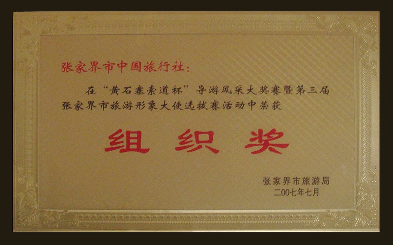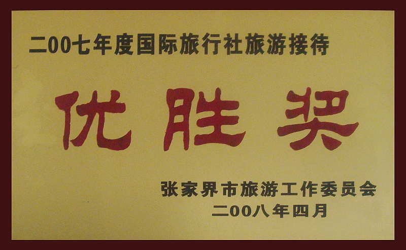 10、2008年4月被張家界市旅游工作委員會評為《2007年度國際旅行社旅游接待優(yōu)勝獎》