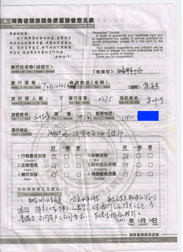 湖北劉先生一行9人旅游質(zhì)量回饋