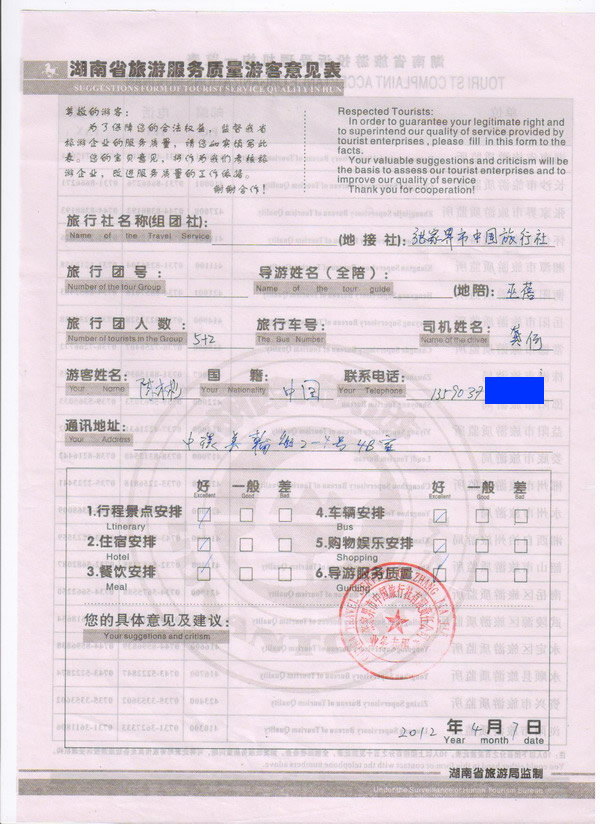 香港陳先生一行7人旅游質量回饋