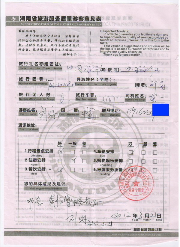 上海劉先生一行6人旅游質量回饋