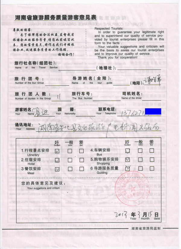湖南夏先生一行11人旅游質(zhì)量回饋單