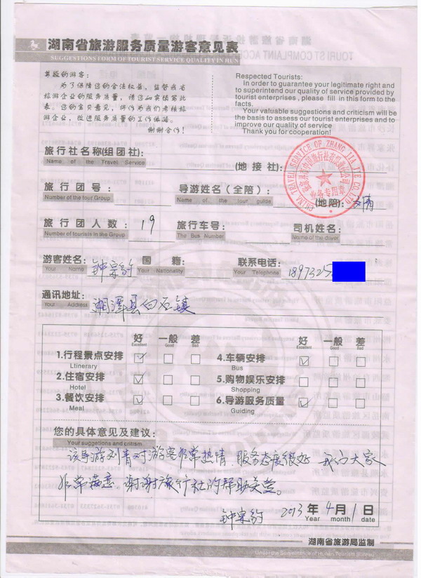 湖南鐘先生一行19人旅游質(zhì)量回饋單