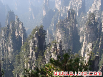 從仙人橋去老屋場,但見深谷里密密麻麻羅列上百座石峰,活像一群威武雄壯的將士列隊(duì)聽令,相傳這是向王天子的神兵在聚會。神話雖不可靠,但石峰如此集中壯觀,在武陵源也屬罕見。我想引用一位美術(shù)大師的話:“豈有此理,莫名奇妙,說也不信,到此方知”。不看神兵聚會,怎知石峰成林。