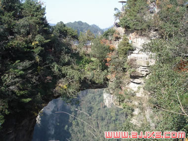 “天下第一橋”橋面寬兩米,厚四米,跨度為二十多米,高度為三百多米,是世界是迄今為止所發(fā)現(xiàn)落差最高的天然石橋?v觀橋下,只見白云飛渡,奇峰突出;才一舉目,已不覺心曠神怡。放眼對面,便是最大的凌空觀景臺——黃石寨,那高高矗立的“六奇閣”在陽光下更是顯得褶褶生輝,在黃石寨與袁家界之間有一道長長的峽谷將兩山隔開,峽谷中有一條小溪水,溪水邊萬木爭春,姹紫嫣紅,溪水從“天下第一橋”下面淙淙流過,這便是有名的“沙刀溝”。