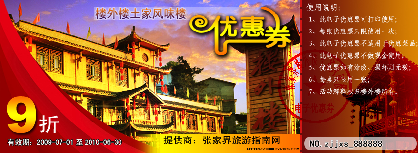 1、此電子優(yōu)惠劵(網(wǎng)絡(luò)版)由張家界樓外樓土家風(fēng)味樓聯(lián)合張家界旅游快車商務(wù)網(wǎng)聯(lián)合發(fā)行,真實有效; |