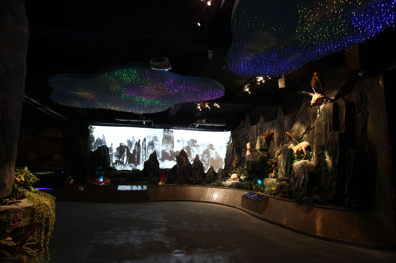 展廳右側(cè)為一幅張家界全景水墨長卷,以多媒體投影的云霧輔助全景畫的形式為游客描繪了一幅奇峰競(jìng)秀、奇花爭(zhēng)妍、云煙繚繞、溪水潺潺、珍禽競(jìng)翔、鳥啼蟬鳴的張家界。畫里的山石自然延伸到了畫外,一些珍禽異獸的標(biāo)本從巖石的縫隙中探出身來,在燈光的襯托下既靈動(dòng)、神秘又切合主題。