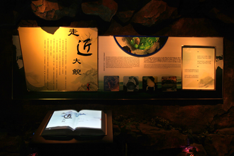 從影視廳出來,步入大鯢文化展區(qū),展區(qū)入口處為一幅竹簡(jiǎn)長卷,長卷呈現(xiàn)了《西澤補(bǔ)遺》里所記載的《鯢志》全文。長卷斜對(duì)面的展區(qū)以雕塑的形式詮釋了《鯢志》中送子魚的典故。與雕塑相接的是光雕形式的《鯢考》,呈現(xiàn)了戰(zhàn)國以來有關(guān)大鯢的古代文獻(xiàn),揭示了中國古代大鯢的分布、用途以及人工養(yǎng)殖的歷史。整個(gè)展區(qū)的右側(cè)為一太極書案,幾卷攤開的竹簡(jiǎn)從案頭下垂到案基,竹簡(jiǎn)上篆刻了大鯢與道家思想淵源的文字,考證了太極拓?fù)洵h(huán)取形于大鯢外形的淵源。書案背后的墻上開了幾扇土家族的花格窗,透過花格窗看到的是一則則道家故事的插圖。書案左手邊為一排美人靠,背景投影湖南鳳凰古城的風(fēng)貌的動(dòng)態(tài)視屏。書案右手邊為金屬珠簾,起到隔斷空間作用,透而不通。整個(gè)展區(qū),意在揭示大鯢與道家思想的淵源。