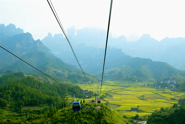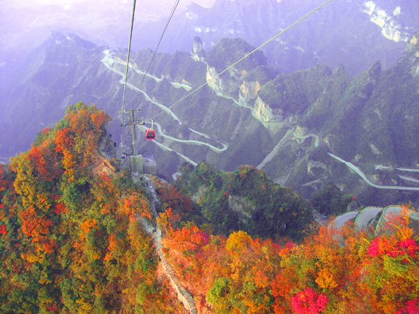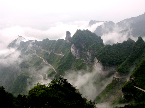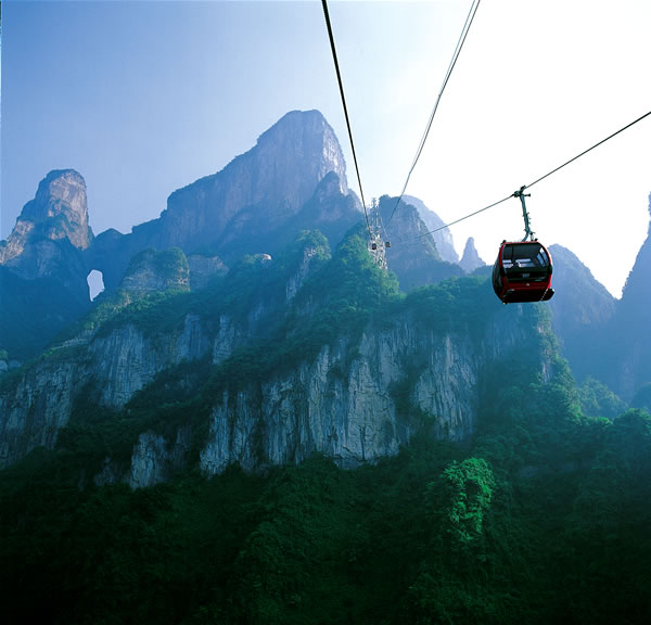 隨通天大道盤旋而上, 可以領(lǐng)略到天門山索道與藍(lán)天白云相映成趣的蔚蔚壯觀和奇絕高險(xiǎn),還能在經(jīng)過(guò)索道中站房時(shí)感受大自然的奇妙和飄然,那座頗似馱滿元寶的烏龜?shù)纳椒褰凶鼋瘕旕W元寶.再收回遠(yuǎn)眺的目光來(lái)看近前,有一道天然畫屏橫在面前,這就是天門畫屏了.仔細(xì)觀望認(rèn)真度量之后會(huì)覺(jué)得整座天門山就如一幅雄踞于天際的妙筆丹青.綠,是生機(jī)盎然的氣息;白,是流溢飛揚(yáng)的風(fēng)采;黑,是雄奇崔巍的俊朗;氤氳的,則是如竺如籟的仙韻.一任斗轉(zhuǎn)星移,風(fēng)云變幻,天門山始終以壁立萬(wàn)傾的雄偉粗獷揮灑著“張家界之魂”的磅礴和雄渾.