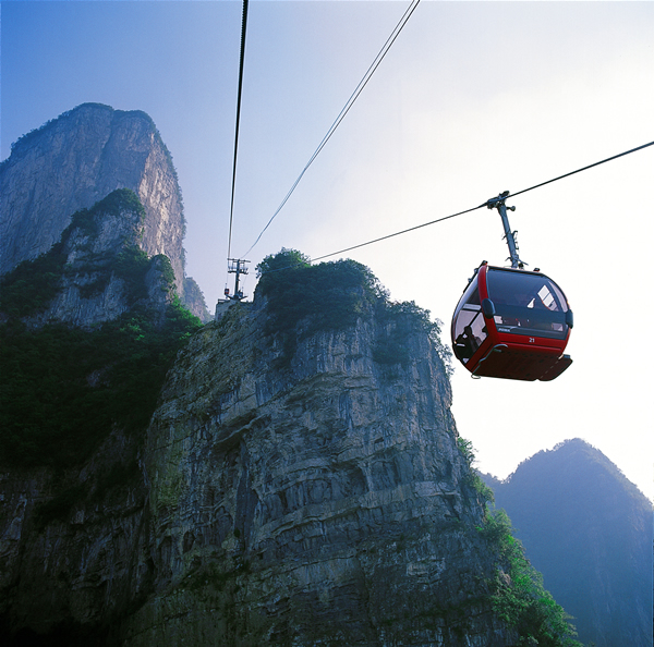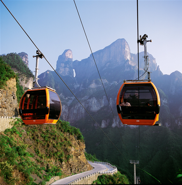 天門山索道線路斜長(zhǎng) 7455 米 ,它以張家界市中心的城市花園為起點(diǎn),直達(dá)天門山頂?shù)脑伎罩谢▓@,猶如一道彩虹飛渡“人間” “ 天上 ” ,又象一條巨龍騰翔 素云蒼穹,依山籍壁,拔地沖天,恢宏壯觀。 天門山索道自 2003 年元月 15 日開工至 2004 年底竣工,總投資 2.26 億元人民幣。由于索道沿線山體高絕奇險(xiǎn),地質(zhì)地貌復(fù)雜多變,設(shè)計(jì)和施工難度遠(yuǎn)遠(yuǎn)超乎一般,整個(gè)建設(shè)過(guò)程艱辛無(wú)比。天門山索道不僅凝結(jié)了中外參建人員的智慧和汗水,也融合了當(dāng)代索道工程最先進(jìn)的科技成果,堪稱當(dāng)代索道工程建設(shè)中的一個(gè)奇跡,一個(gè)里程碑。 天門山索道綜合了世界上最尖端的客運(yùn)索道技術(shù),索道共有 57 個(gè)支架,其中含 3 個(gè)水平救護(hù)支架,支架由國(guó)內(nèi)生產(chǎn),主要設(shè)備均由法國(guó)波瑪公司供應(yīng),索道鋼繩來(lái)自于法國(guó), 98 個(gè)吊廂來(lái)自瑞士 CWA 公司,單個(gè)造價(jià)高達(dá) 20 萬(wàn)元人民幣。。索道的 運(yùn)載索 張緊系統(tǒng)采用液壓張緊方式,設(shè)一個(gè)中間驅(qū)動(dòng)站,是世界上最長(zhǎng)的單線循環(huán)脫掛抱索器車廂式索道。轎廂體高 2 米 ,單個(gè)造價(jià)高達(dá) 20 萬(wàn)元人民幣。索道鋼繩為 6 × 36WS 型,直徑 50.5 毫米 ,每米重達(dá) 10 公斤 ,索距 6.2 米 ,索道運(yùn)行速度為每秒 6 米 ,按順時(shí)針?lè)较蜻\(yùn)行,每?jī)蓚(gè)吊廂的間距為 172.8 米 ,時(shí)間間隔為 28.8 秒,單向運(yùn)量為每小時(shí) 1000 人,最大爬坡角 38.6 度,這在世界均屬罕見。 天門山索道最大的亮點(diǎn)就是它的爬坡面支架的設(shè)計(jì) ,這個(gè)支架共有壓索輪 96 個(gè),托索輪 16 個(gè),它綜合了現(xiàn)代物理學(xué)、現(xiàn)代工程學(xué)、現(xiàn)代制造業(yè)中最先進(jìn)的理論和成果,應(yīng)用了世界最先進(jìn)的索道技術(shù),從而使這段索道總給人一種蕩氣回腸、氣勢(shì)沖天的感覺(jué)。 同時(shí)為應(yīng)對(duì)臨時(shí)發(fā)生的特殊情況,天門山索道設(shè)計(jì)了 “ 水平救護(hù) ” 和 “ 垂直,用于索道突然處于全面癱瘓時(shí)將游客安全救護(hù)至地面,這是目前世界上索道中的一套最完備最先進(jìn)的救護(hù)系統(tǒng)。并為確保特殊天候下的安全,索道站房都安裝了防雷電設(shè)備。