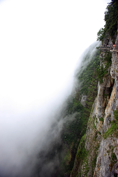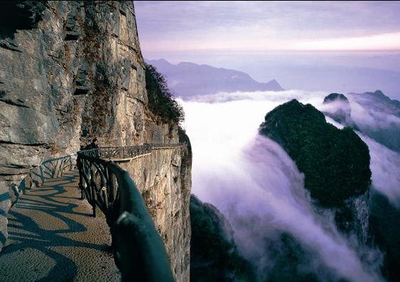 游覽通天大道,令人感受最深的也許就是一個(gè)“驚”字.驚“通天大道”蜿延峻巡于群山絕壁之上的絕險(xiǎn),驚“通天大道”艱苦建筑于壁立萬(wàn)傾之中的奇?zhèn)?驚“通天大道”玉帶飄揚(yáng)于寰宇蒼穹之間的人類創(chuàng)造史的奇跡.