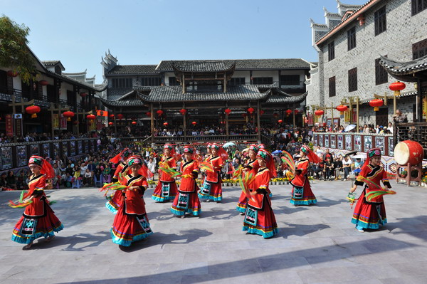 時(shí)間尚早,一百多里路程,還是先填飽肚子吧。拱極門邊臨時(shí)的表演臺(tái)上,一個(gè)穿著入時(shí)的乾州人,正在工作人員的幫助下,歡天喜地的表演著“人背后頭球”活動(dòng)。“游湘西,奔乾城,全民參與,老少皆宜”的大字,隱含乾州人對(duì)生活的幸福之情。