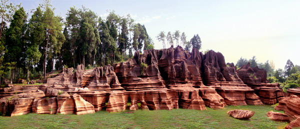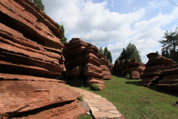 大約在四億八千萬年前的早奧陶時(shí)期,紅石林地域?qū)俚厥飞纤Q的揚(yáng)子古海。海底沉積了大量混合泥沙的碳酸鹽物質(zhì),經(jīng)過地殼運(yùn)動(dòng)海底被抬起,在大自然風(fēng)化、水蝕、溶蝕和重力的外動(dòng)力地質(zhì)作用下,形成了這片美麗的地質(zhì)奇觀——中國唯一的紅色炭酸鹽巖石林。由于巖石物質(zhì)成分的差異,石牙芽、石林、有多種多樣的顏色。含鐵質(zhì)較多的,經(jīng)氧化后形成紅色;含泥質(zhì)較多的,一般呈灰色、灰綠色;含碳酸鹽較純的,一般呈白色。這樣形成的五彩石林,其中以紅色石林分布最廣,故為紅石林。