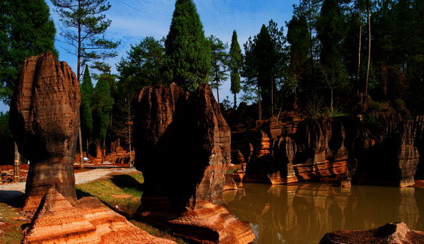 景區(qū)由紅色石林巖溶地貌和峽谷地貌以及暗河、湖泊、瀑布、洞穴地貌組成。它包括了石林、峰叢、石柱、河流、湖泊、暗河、瀑布、洞穴、巖溶洼地、標(biāo)準(zhǔn)地質(zhì)剖面和古生物化石等地質(zhì)遺跡組成。構(gòu)成了有的如神龜探海,鷹擊長空,有的像紫荊花恕放,海洋冰床,有的像城堡峰,有的像乳燕待哺、蝸牛搬家,有的如七彩迷宮,有的如少女出浴、捧手祈福、觀音坐蓮,有的像石鞭候主、神龜探海,有的如神雕望月、錦雞鳴喜等形態(tài)多樣、色彩斑瀾、層次分明、美妙神奇、絢麗壯觀的地質(zhì)地貌景觀。